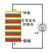 伏打最開始用幾只碗盛了鹽水,把幾對黃銅和鋅做成的電極連接起來,就產(chǎn)生了電流。之后他用更多的銅片和鋅片接觸,并且用相同數(shù)目的水層或比純水更好的導電液體層(食鹽、堿水)或皮革等海綿狀的物體間隔開,這樣一來,每一節(jié)原電池有一塊銅片和一塊鋅片用作電極,它們之間是一片浸過鹽水的布,作為電解質(zhì)。每個原電池有一個小的電動勢,而后伏打發(fā)現(xiàn),把這些原電池疊起就會有一個大的電動勢。并且原電池的一端帶正電,另一端帶負電,由此構(gòu)成一個電流回路。