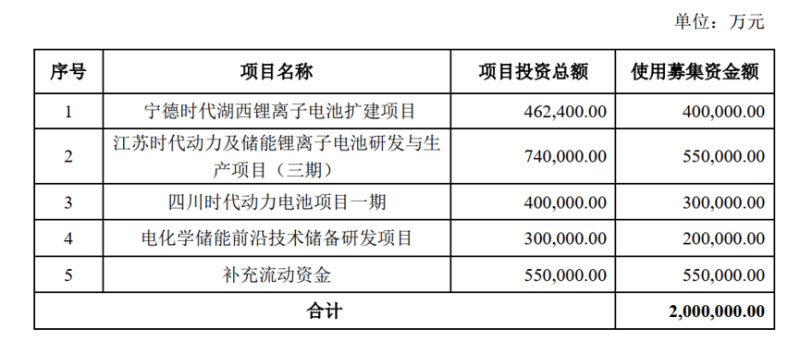 此次寧德時(shí)代募集的資金擬投向5個(gè)項(xiàng)目。其中,“寧德時(shí)代湖西鋰離子電池?cái)U(kuò)建項(xiàng)目”、“江蘇時(shí)代動(dòng)力及儲(chǔ)能鋰離子電池研發(fā)與生產(chǎn)項(xiàng)目(三期)”和“四川時(shí)代動(dòng)力電池項(xiàng)目一期”新增鋰離子電池年產(chǎn)能分別約為16GWh、24GWh和12GWh,總計(jì)約為52GWh。