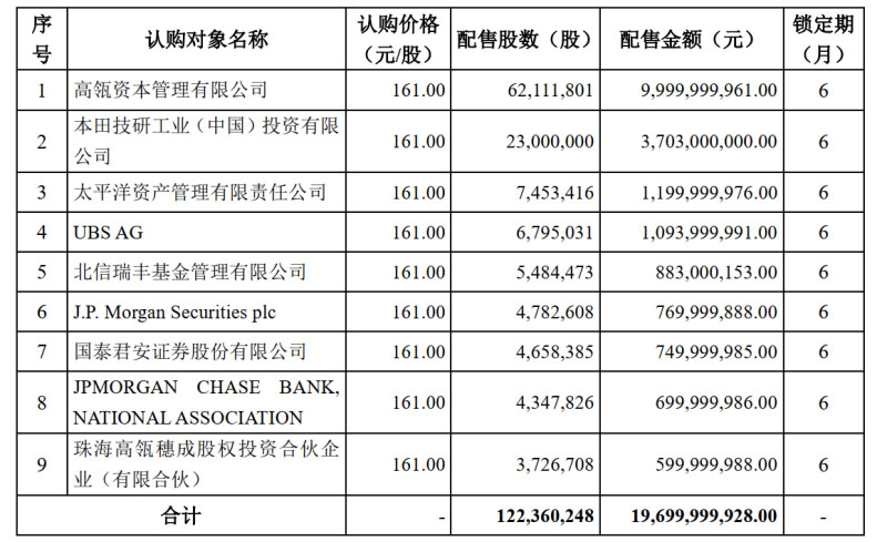 除了高瓴資本之外,認(rèn)購(gòu)方還包括本田技研工業(yè)(中國(guó))投資有限公司、太平洋資產(chǎn)管理有限責(zé)任公司、UBS AG、北信瑞豐基金管理有限公司、J.P. Morgan Securities plc等。