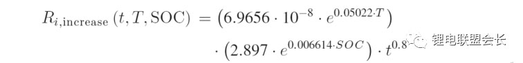 隨著鋰離子電池存儲(chǔ)時(shí)間的增加,電池不斷老化,其內(nèi)阻不斷增大。不同類型的鋰電池內(nèi)阻變化程度不同。在經(jīng)歷9-10月長時(shí)間的存儲(chǔ)后,LFP電池的內(nèi)阻增加率比NCA和NCM電池的內(nèi)阻增加率高。內(nèi)阻的增加率與存儲(chǔ)時(shí)間、存儲(chǔ)溫度和存儲(chǔ)SOC相關(guān),Stroe 等通過對(duì) LFP/C 電池24~36個(gè)月的存儲(chǔ)研究量化了它們之間的關(guān)系(如下):