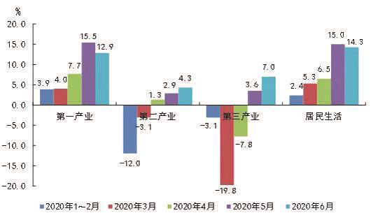 6月份,第一、二、三產(chǎn)業(yè)和居民生活用電量增速分別為12.9%、4.3%、7.0%和14.3%。其中,第二、三產(chǎn)業(yè)用電量增速較5月份分別回升1.4、3.5個(gè)百分點(diǎn),生產(chǎn)經(jīng)營(yíng)活動(dòng)水平繼續(xù)提升,第一產(chǎn)業(yè)和居民生活用電量增速連續(xù)兩個(gè)月超過(guò)10%。上半年,三次產(chǎn)業(yè)和居民生活用電量增速分別為8.2%、-2.5%、-4.0%和6.6%,第二、三產(chǎn)業(yè)運(yùn)行較去年仍有差距。