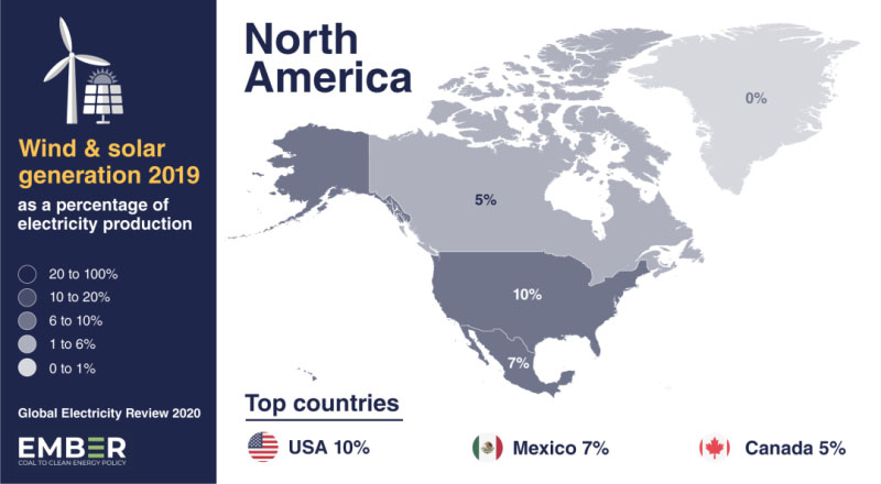 美國(guó)2019年風(fēng)能和太陽能發(fā)電量占總發(fā)電量的10%、墨西哥7%、加拿大5%。墨西哥建設(shè)新風(fēng)能和太陽能的速度最快,自2016年以來所占比例已經(jīng)翻了一番。盡管擁有豐富的風(fēng)能開發(fā)自然資源,但加拿大的份額最低,增長(zhǎng)最慢。在北美,風(fēng)力發(fā)電比太陽能發(fā)電更為普遍。2019年,風(fēng)力發(fā)電的發(fā)電量是太陽能發(fā)電量的三倍。