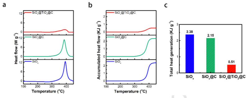 圖8b和8c比較并計算了累計熱流量,對于SiOx@TiO2@C,其放熱量為0.51 KJ g-1,明顯低于SiOx的2.38 KJ g-1和SiOx@C的2.15 KJ g-1。放熱量降低了4倍,顯示了SiOx@TiO2@C的安全性顯著提升。