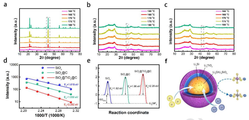 圖7.與電解液反應后的XRD譜圖 (a)SiOx,(b) SiOx@C,(c)SiOx@TiO2@C.(d)SiOx,SiOx@C,SiOx@TiO2@C副反應活化能擬合對比. (e)與電解液反應能量變化圖. (f)TiO2層作為多功能包覆層示意圖.