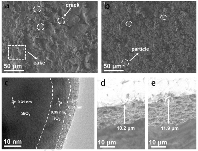 圖5. 循環(huán)前后電極形貌對比(a)循環(huán)50圈后SiOx電極形貌SEM圖.(b)循環(huán)600圈后SiOx@TiO2@C電極形貌SEM圖.(c)循環(huán)600圈后SiOx@TiO2@C電極 TEM圖. SiOx@TiO2@C電極的循環(huán)前后電極厚度對比:(d)循環(huán)前,(e)循環(huán)600圈后.