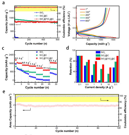 圖4b中循環(huán)過程容量-電壓曲線也證明了SiOx@TiO2@C電極的高循環(huán)穩(wěn)定性。