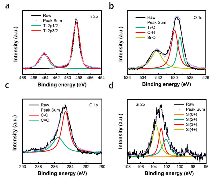 圖2b中三種狀態(tài)的氧特征峰(529.3 eV,530.1 eV,532.3 eV)分別對應于Ti-O、O-H、Si-O,顯示了Ti-OH和Si-O鍵的存在。