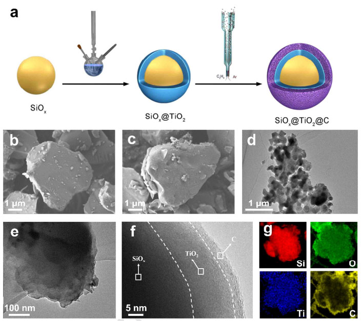 圖1.(a)SiOx@TiO2@C復合物的制備.(b)原始SiOx的SEM照片. (c)SiOx@TiO2@C復合物的SEM照片. (d-g)SiOx@TiO2@C復合物的HR-TEM照片及對應的不同元素EDS掃描圖片。
