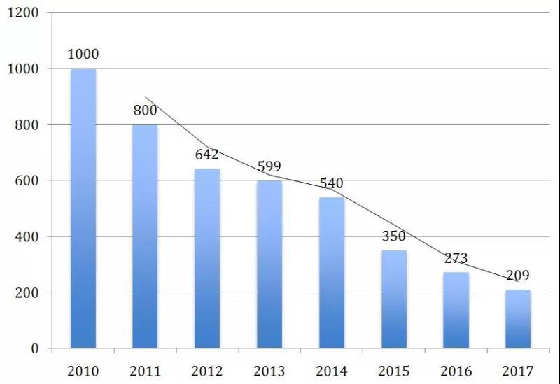 圖4 2010~2017年鋰離子電池價(jià)格(單位:美元/千瓦時(shí))