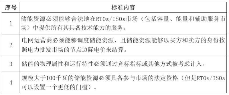 電力市場(chǎng)規(guī)則方面,美國(guó)對(duì)儲(chǔ)能參加電力市場(chǎng)比較重視,美國(guó)聯(lián)邦能源監(jiān)管委員會(huì)(FERC)2013年發(fā)布792號(hào)法令簡(jiǎn)化小型發(fā)電設(shè)備并網(wǎng)流程,2015年發(fā)布745號(hào)法令允許消費(fèi)端能源產(chǎn)品和服務(wù)參與批發(fā)電力市場(chǎng),2016年開(kāi)始就儲(chǔ)能與分布式能源參與電力市場(chǎng)方面的規(guī)則進(jìn)行建議征集和全面修改。2018年2月,F(xiàn)ERC發(fā)布841號(hào)法令的草案,正式要求區(qū)域輸電組織(RTOs)和獨(dú)立系統(tǒng)運(yùn)營(yíng)商(ISOs)建立相關(guān)的批發(fā)電力市場(chǎng)模式、市場(chǎng)規(guī)則,包括儲(chǔ)能技術(shù)參數(shù),參與市場(chǎng)的規(guī)模要求以及資格等,以便使儲(chǔ)能可以參與RTOs/ISOs運(yùn)營(yíng)的所有電力市場(chǎng)。針對(duì)市場(chǎng)參與模式、市場(chǎng)規(guī)則的建立,F(xiàn)ERC提出四項(xiàng)標(biāo)準(zhǔn)(見(jiàn)表1)。在電力市場(chǎng)規(guī)則方面,除了FREC的841號(hào)法案外,美國(guó)儲(chǔ)能產(chǎn)業(yè)發(fā)展的主要思路包括將儲(chǔ)能列為獨(dú)立的電力資產(chǎn),定義儲(chǔ)能參與電力市場(chǎng)的模式,降低儲(chǔ)能參與電力市場(chǎng)的門檻等。