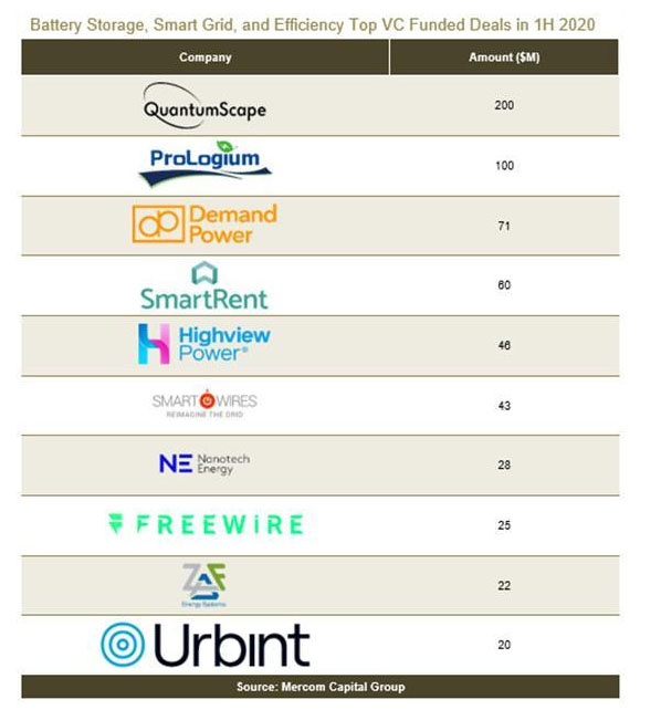 2020年上半年的前5大風(fēng)投融資交易如下:QuantumScape籌集了2億美元,ProLogium Technology籌集了1億美元,Demand Power Group獲得了7,100萬美元,Highview Power獲得了4,600萬美元,Nanotech Energy獲得了2,800萬美元。