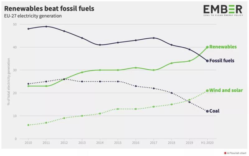 2020年上半年,歐洲的電力轉(zhuǎn)型取得新的進(jìn)展,可再生能源發(fā)電量增長了11%,首次超過化石能源發(fā)電量。這延續(xù)了過去10年的趨勢,可再生能源正逐步取代化石能源。2020年上半年可再生能源發(fā)電量占?xì)W盟27國的40%,而化石燃料發(fā)電量占34%,主要是因?yàn)槊禾恳呀?jīng)被風(fēng)能和太陽能所取代。