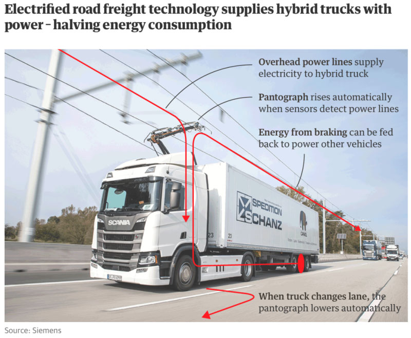 針對這一問題,英國可持續(xù)道路貨運(yùn)中心(Centre for Sustainable road Freight)報告建議,通過建設(shè)全國“電子高速公路”(e-highways),為電動卡車安裝架空充電電纜。這些由國家電網(wǎng)供電的接觸網(wǎng)電纜將通過一個可伸縮裝置與行駛在7000公里英國公路內(nèi)側(cè)車道上的貨車相連,類似于電動火車頂部的索具。電纜的電力將為卡車的電動機(jī)提供動力,同時為車上的電池充電,使汽車能夠行駛在電氣化道路以外的目的地。西門子(Siemens)公司和卡車制造商Scania已經(jīng)在德國、瑞典和美國對e-highway電動道路系統(tǒng)進(jìn)行了廣泛的測試。
