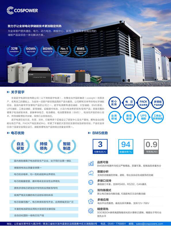 昆宇電源成立于2019年,公司繼承了光宇集團30余年的技術(shù)沉淀和市場積累,是國內(nèi)最早開發(fā)鋰電產(chǎn)品的公司,致力于讓電化學(xué)儲能技術(shù)更加穩(wěn)定純熟,為全球客戶提供通信、電力、動力、數(shù)據(jù)中心、家用、船用等多領(lǐng)域應(yīng)用的儲能產(chǎn)品及綜合一體化解決方案。公司擁有豐富的技術(shù)儲備,通信基站儲能系統(tǒng)、新能源動力電池系統(tǒng)、大型電力儲能系統(tǒng)(BESS)、大數(shù)據(jù)能源監(jiān)控系統(tǒng)(EMS)、IDC UPS用鋰電池全產(chǎn)品技術(shù)水平位居全球領(lǐng)先地位。