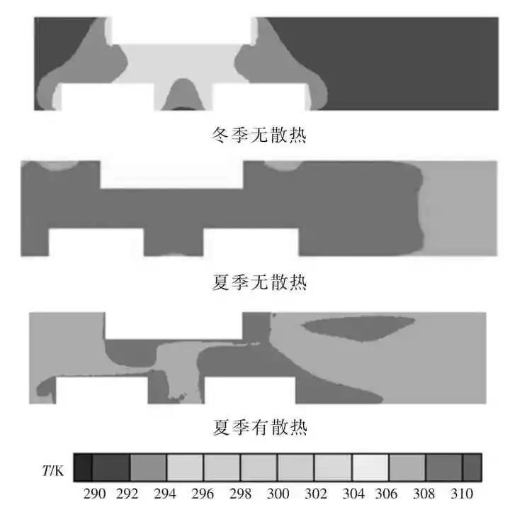 環(huán)境溫度是對(duì)儲(chǔ)能集裝箱溫度場(chǎng)分布的主要影響因素之一。圖2 為冬季工況(環(huán)境溫度280 K)和夏季工況(環(huán)境溫度308 K)下的儲(chǔ)能集裝箱內(nèi)部截面(Y=2 m)溫度分布云圖。