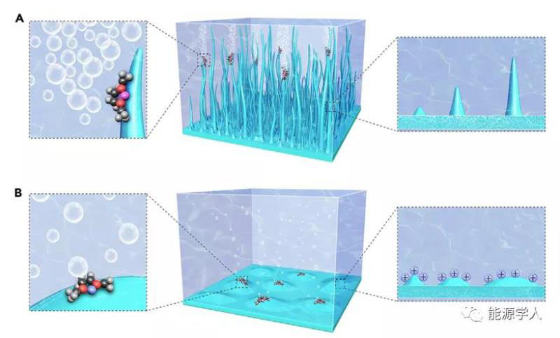 圖5 陽離子添加劑作用示意圖。(A)不含陽離子添加劑的電解液。電解液析氣劇烈,陽極呈樹枝狀結(jié)構(gòu)。(B)含有陽離子添加劑的電解液。由于靜電屏蔽效應(yīng),在一定程度上阻止了電解液析氣,陽極呈現(xiàn)出光滑的形貌。