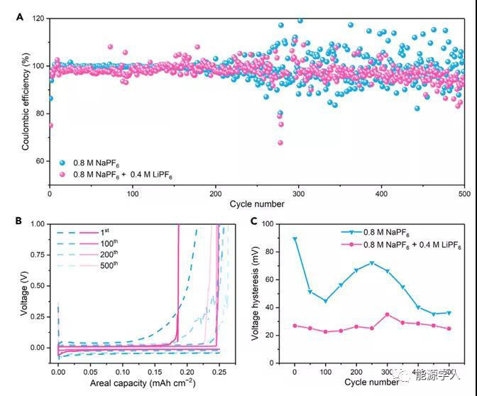 進(jìn)一步進(jìn)行電化學(xué)測試,以證明鋰離子添加劑在鈉金屬電池中的實(shí)際性能。結(jié)果顯示,使用Li+添加劑,可以顯著提高200次循環(huán)后的庫侖效率。更重要的是,Li+添加劑可顯著降低電壓滯后。此外,Li+添加劑對Na剝離行為也有明顯影響。
