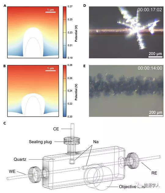 為了證明陽離子添加劑對鈉沉積的靜電屏蔽效應(yīng),進(jìn)行了有限元模擬和原位光學(xué)顯微鏡觀察。陽離子添加劑對鈉沉積產(chǎn)生靜電屏蔽作用,抑制鈉枝晶生長。