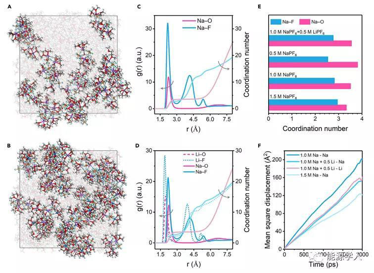 通過分子動力學(xué)模擬進(jìn)一步探討了鋰離子對電解質(zhì)性質(zhì)的影響。為了定量分析溶劑化結(jié)構(gòu),進(jìn)行了徑向分布函數(shù)g(r)分析,總結(jié)了不同電解質(zhì)中Na+與O/F的配位數(shù)。
