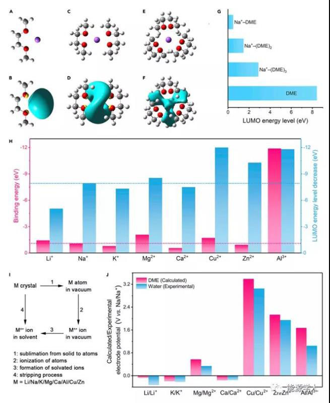 考慮到陽離子添加劑的電極電位應(yīng)低于鈉金屬負(fù)極,作者建議使用Li+、K+和Ca2+。綜合考慮到LUMO能級的降低和結(jié)合能,Li+是最佳的候選元素。鋰離子的電極電位是-0.08 V vs Na/Na+,若添加劑的濃度比實(shí)際電池中的工作離子小得多,該電位幾乎不會變正。此外,Li+與DME分子的結(jié)合能比Na+大,不易脫溶劑化。因此,鋰離子不能在鈉金屬負(fù)極上還原。更重要的是,Li+對DME的LUMO水平降低比Na+小,可以穩(wěn)定電解質(zhì)溶液。
