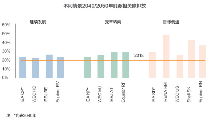 在“延續(xù)發(fā)展”情景集下,全球能源相關(guān)碳排放持續(xù)增長,雖增速有所放緩,但2050年仍較當前水平增長10%-30%,達到360-420億噸;在“變革轉(zhuǎn)向”情景集下,全球能源相關(guān)碳排放在2030-2040年間進入下行態(tài)勢,2050年約為當前水平的90%;在“目標倒逼”情景集下,全球能源相關(guān)碳排放需在2025年前達峰,2050約為當前水平的30%-50%,IRENA能源轉(zhuǎn)型路線圖、Equinor更新情景下2050年分別降至98、106億噸。