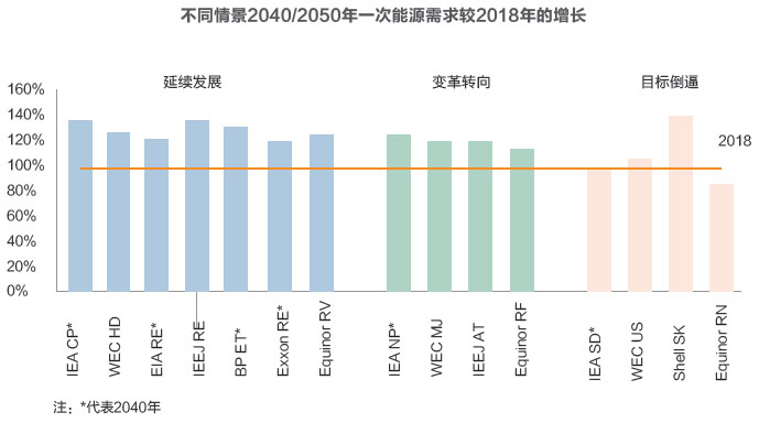 不同機構(gòu)的世界能源展望報告中展望期不同、側(cè)重點各異、計量法有別,本文研究選取2040/2050年為主要的觀察“橫切面”;聚焦于全球?qū)用娴哪茉葱枨?、品種結(jié)構(gòu)、電力供需、碳排放等,未深入至分地區(qū)和分部門層面;主要從增長幅度、結(jié)構(gòu)占比、達峰時間等維度進行對比,未考慮計量單位、折算方法、統(tǒng)計口徑等差異將不同展望情景的絕對數(shù)值劃歸至統(tǒng)一口徑。
