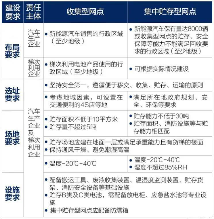 電池回收網(wǎng)點(diǎn)分為收集型網(wǎng)點(diǎn)和集中貯存型網(wǎng)點(diǎn)。這兩類(lèi)網(wǎng)點(diǎn)分工也不難理解,收集型網(wǎng)點(diǎn)是收集、暫存廢舊動(dòng)力電池的場(chǎng)地,主要用于存放從車(chē)主手中回收到的動(dòng)力電池;集中貯存型網(wǎng)點(diǎn),則是大批量?jī)?chǔ)存報(bào)廢車(chē)輛或者廢舊動(dòng)力電池的場(chǎng)地,用于中轉(zhuǎn)、集中儲(chǔ)運(yùn)回收上來(lái)的動(dòng)力電池。