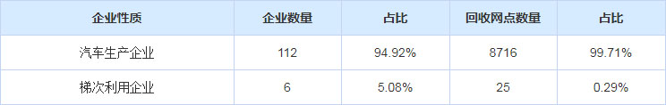 汽車(chē)之家統(tǒng)計(jì)出工信部公布的動(dòng)力電池回收網(wǎng)點(diǎn)情況,截至2020年5月,全國(guó)共有回收服務(wù)網(wǎng)點(diǎn)8741個(gè),其中涉及整車(chē)企業(yè)112家,梯次利用企業(yè)6家。從網(wǎng)點(diǎn)分布情況來(lái)看,車(chē)企建立的回收網(wǎng)點(diǎn)占據(jù)絕大部分?jǐn)?shù)量,在全國(guó)各地均有覆蓋。從具體網(wǎng)點(diǎn)來(lái)看,以汽車(chē)企業(yè)4S店網(wǎng)絡(luò)為主,也有少部分與車(chē)企合作的報(bào)廢拆解企業(yè)建立的網(wǎng)點(diǎn),以及梯次利用企業(yè)建立的網(wǎng)點(diǎn)。