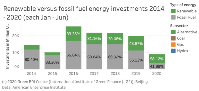 2014年中國在一帶一路國家能源領(lǐng)域總投資額為145.4億美元,其中化石能源占比80.4%,可再生能源占比19.6%;2019年總投資為196.7億美元,其中化石能源占比已降至56.1%,而可再生能源占比升至43.9%。疫情之下,2020年上半年中國在一帶一路國家能源領(lǐng)域投資仍在持續(xù),總投資額為88.1億美元,可再生能源占比首次超過化石能源達(dá)58.1%,而化石能源占比41.9%。
