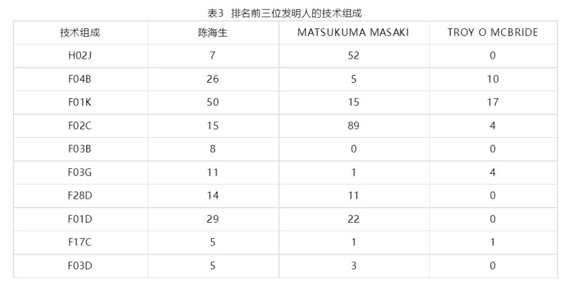 統(tǒng)計(jì)排名前三位發(fā)明人的技術(shù)組成情況:陳海生在F01K(蒸汽機(jī)裝置、貯汽器、不包含在其他類目中的發(fā)動(dòng)機(jī)裝置、應(yīng)用特殊工作流體或循環(huán)的發(fā)動(dòng)機(jī))技術(shù)分支上的發(fā)明專利量相對(duì)于其他分支最高,為50件;在F01D(非變?nèi)菔綑C(jī)器或發(fā)動(dòng)機(jī),如汽輪機(jī))及F04B(液體變?nèi)菔綑C(jī)械;泵)技術(shù)分支上申請(qǐng)量相對(duì)較高,分別為29件及26件。陳海生在F01K、F01D及F04B等技術(shù)分支上均有一定的研究,研究范圍較廣。MATSUKUMA MASAKI在F02C(燃?xì)廨啓C(jī)裝置;噴氣推進(jìn)裝置的空氣進(jìn)氣道;空氣助燃的噴氣推進(jìn)裝置燃料供給的控制)技術(shù)分支上發(fā)明量較高,為89件,說(shuō)明在此技術(shù)分支上研究的較深入。TROY O MCBRIDE在F01K(蒸汽機(jī)裝置;貯汽器;不包含在其他類目中的發(fā)動(dòng)機(jī)裝置;應(yīng)用特殊工作流體或循環(huán)的發(fā)動(dòng)機(jī))上發(fā)明量較高,為17件。