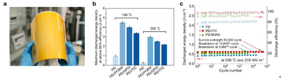 a:聚合物-分子半導(dǎo)體全有機(jī)復(fù)合介電薄膜. b:全有機(jī)復(fù)合介電材料(PEI/DPDI、PEI/PCBM、PEI/ITIC)高溫儲(chǔ)能特性遠(yuǎn)優(yōu)于傳統(tǒng)高溫介電聚合物(PEI). c:高溫高場(chǎng)下全有機(jī)復(fù)合介電薄膜長(zhǎng)期工作循環(huán)性能.