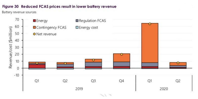 大型電池儲(chǔ)能系統(tǒng)為此獲得了豐厚的回報(bào),但是盡管澳大利亞能源市場(chǎng)運(yùn)營(yíng)商(AEMO)為幫助管理電網(wǎng)而對(duì)頻率控制與輔助服務(wù)(FCAS)的需求急劇增加,但頻率控制與輔助服務(wù)(FCAS)的收入仍在第二季度急劇下降。