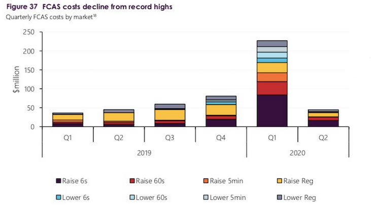 澳大利亞能源市場(chǎng)運(yùn)營(yíng)商(AEMO)指出,盡管頻率控制與輔助服務(wù)(FCAS)要求急劇增加(見上表),但其總成本(包括由化石燃料發(fā)電設(shè)施中的傳統(tǒng)供應(yīng)商交付的成本)仍從歷史最高點(diǎn)下降。