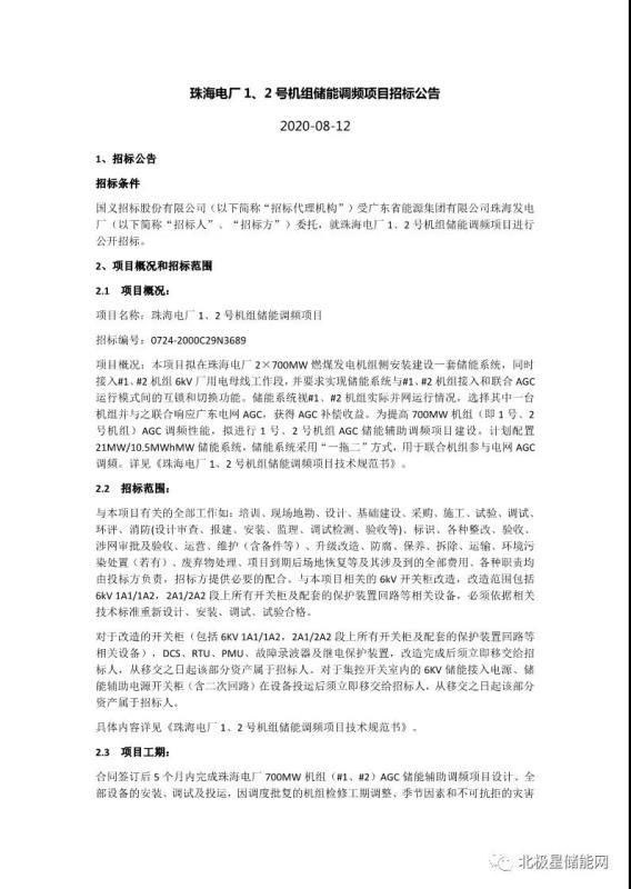 8月12日,珠海電廠1、2號機(jī)組儲能調(diào)頻項目進(jìn)行公開招標(biāo)。計劃配置21MW/10.5MWh儲能系統(tǒng),儲能系統(tǒng)采用“一拖二”方式,用于聯(lián)合機(jī)組參與電網(wǎng)AGC調(diào)頻,合同簽訂后5個月內(nèi)完成。