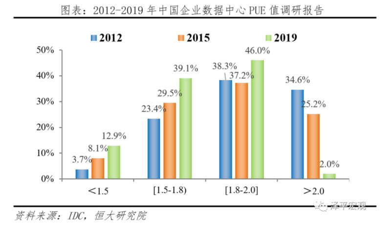 根據(jù)IDC發(fā)布的《2019中國(guó)企業(yè)綠色計(jì)算與可持續(xù)發(fā)展研究報(bào)告》:2019年,我國(guó)超過85%的數(shù)據(jù)中心PUE值在1.5-2.0水平(如下圖)。