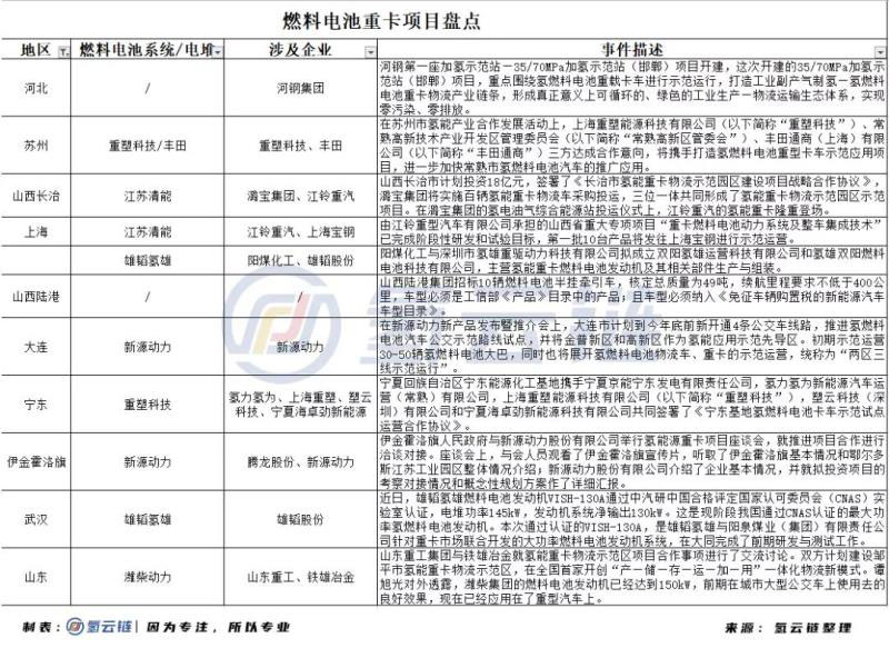 表1 全國(guó)燃料電池重卡項(xiàng)目