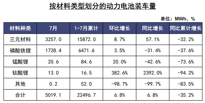 前7月,我國(guó)動(dòng)力電池裝車量累計(jì)22.5GWh,同比累計(jì)下降35.2%。其中三元電池裝車量累計(jì)15.9GWh,占總裝車量70.6%,同比累計(jì)下降32.2%;磷酸鐵鋰電池裝車量累計(jì)6.5GWh,占總裝車量28.8%,同比累計(jì)下降37.6%。