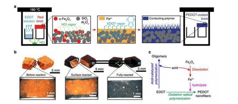 圖|將紅磚表面的氧化鐵轉(zhuǎn)化為一種藍色可導(dǎo)電塑料(來源:Nature Communications)