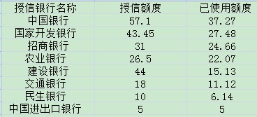 其中,據(jù)記者統(tǒng)計(jì),中國(guó)銀行共授信57.1億元,已使用額度37.27億元;國(guó)家開(kāi)發(fā)銀行共授信43.45億元,已使用額度27.48億元;招商銀行共授信31億元,已使用額度24.66億元;農(nóng)業(yè)銀行共授信26.5億元,已使用額度22.07億元;建設(shè)銀行授信44億元,已使用額度15.13億元;交通銀行共授信18億元,已使用額度11.12億元;民生銀行共授信10億元,已使用額度6.14億元;中國(guó)進(jìn)出口銀行共授信5億元,已使用額度5億元。