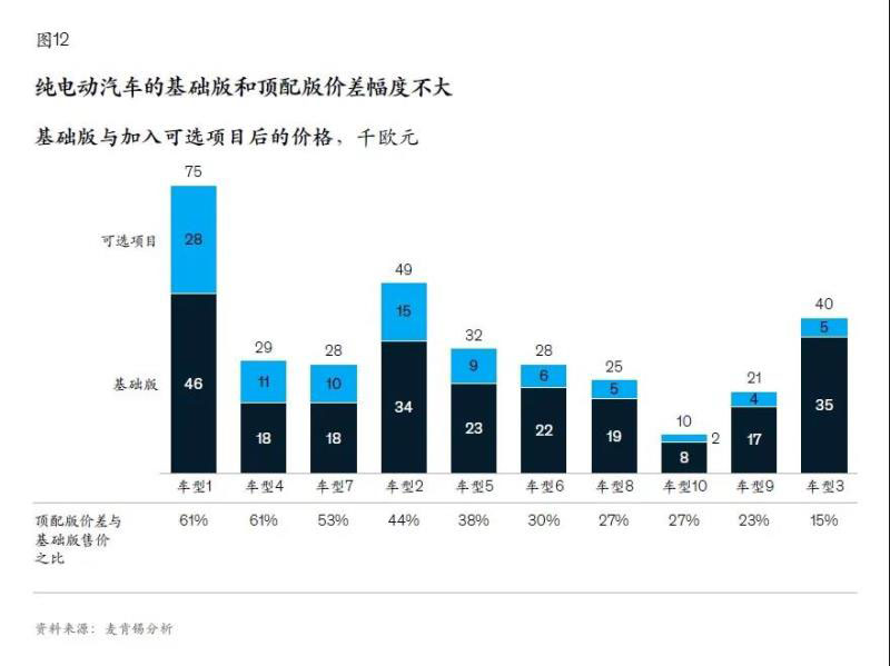 這10款車型中的7款從基礎(chǔ)版到頂配版的價差幅度不超過50%(圖12)。10款中有5款提供方案以外的電池或發(fā)動機升級,有三款提供更昂貴的車身選擇,比如顏色和輪轂。由此來看,在定價策略或非硬件收入方面(例如無線軟件更新)似乎存在著有待挖掘的收入潛能。總之,國際汽車廠商可將我們的研究發(fā)現(xiàn)視為簡化產(chǎn)品組合或?qū)で蟛町惢膮⒖?,尤其是?dāng)它們考慮進入中國市場時。