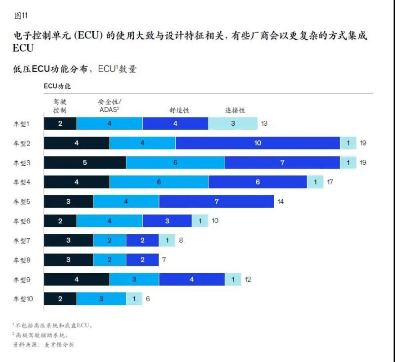 電子電氣架構(gòu)。本次對標(biāo)測試顯示,在具備相似功能的車型之間,低壓線束的重量各有不同。這表明在電子電氣架構(gòu)中存在重大的設(shè)計和成本優(yōu)化空間。與此類似,參與此次測試的廠商各自選擇了不同的ADAS9功能,采用了不同的電子控制單元(ECU)集成設(shè)計,所使用的ECU數(shù)量也各不相同。這些車型裝配了6~19個分散式ECU(圖11)。一個潛在的發(fā)展方向是將所有功能集成在單一汽車控制器中,如美國一家純電動汽車廠商的做法。藉此,廠商或可以相對較低的成本實現(xiàn)性能提升,但這需要大量研發(fā)投資,以及先進的內(nèi)部軟件開發(fā)能力。