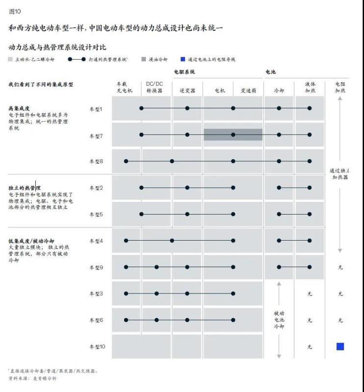 此外,物理集成度也各不相同。只有三個車型顯示了較高的集成水平:電子組件和電氣驅(qū)動系統(tǒng)實現(xiàn)了物理集成,且熱管理系統(tǒng)涵蓋了所有組件。另有兩個車型顯示出相同的物理集成水平,但電驅(qū)系統(tǒng)和電池部分的熱管理系統(tǒng)是分離的。其余車型使用了較少集成組件:單獨的電氣模塊和單獨的熱管理。其中三個車型使用了被動風(fēng)冷方式,此類車型相比使用電池水冷技術(shù)的車型,充電速度受限(圖10)。