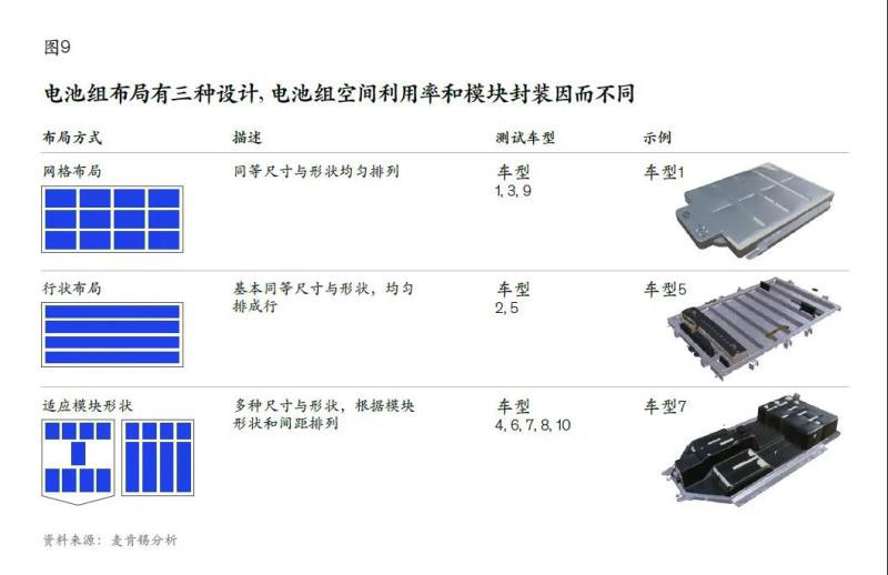 動力總成。此次對標(biāo)分析揭示出各種各樣的動力總成設(shè)計理念,包括電池布局、熱管理設(shè)計與布線,以及動力系統(tǒng)模塊集成。我們的3-D模型顯示一半的車型使用了網(wǎng)格和行狀的電池組布局,這增加了空間利用率,同時,這種布局相比多尺寸電池模組,減少了封裝變化,可降低模組生產(chǎn)成本(圖9)。