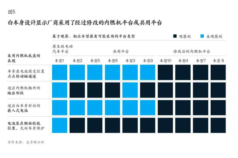 為快速提供多種純電動汽車產(chǎn)品和車型,中國多數(shù)純電動汽車廠商均通過調(diào)整現(xiàn)有內(nèi)燃機平臺或使用多用途通用平臺來制造汽車。在物理拆解過程中,我們也利用3D數(shù)字孿生/虛擬現(xiàn)實軟件比較了這些車型的設(shè)計。這項工作讓我們看到,10款純電動汽車中,9款在電池形狀、電池位置以及地板形狀等方面具備相似特征。由此可見,這些車型都使用了過去的內(nèi)燃機底盤,也就是說,它們采用的是經(jīng)過修改或可共用的內(nèi)燃機平臺(圖5)。同樣,采用相似設(shè)計有助于推進產(chǎn)業(yè)化,因為現(xiàn)有工藝和制造技術(shù)藍圖都能派上用場。在產(chǎn)品開發(fā)流程中,產(chǎn)業(yè)化占了相當(dāng)大的比重,這種方式對于縮短產(chǎn)品上市周期至關(guān)重要。