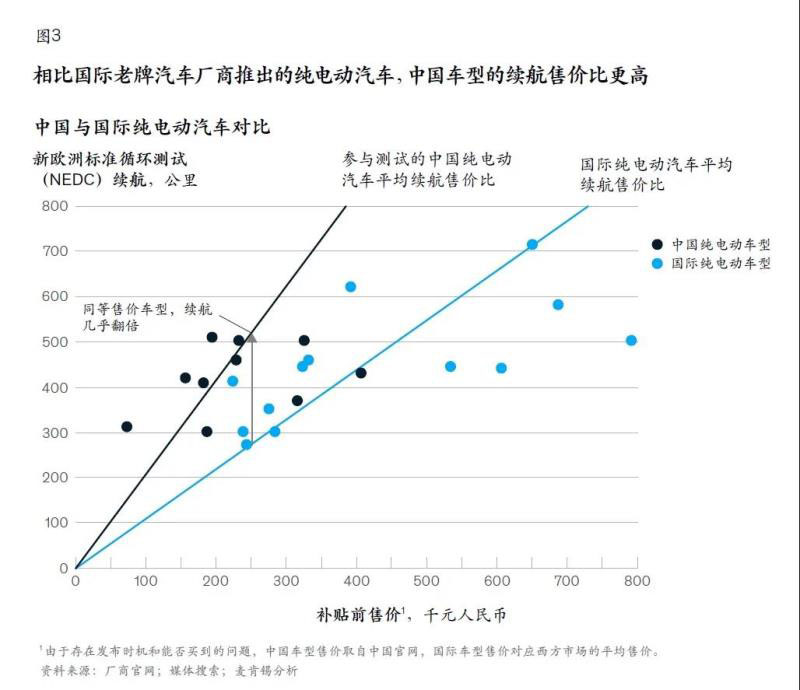 參與對標(biāo)分析的所有車型的絕對續(xù)航時間和動力均不亞于歐、美、日同類車型,而在續(xù)航售價比方面則更勝一籌(圖3)。參加測試的中國純電動汽車的續(xù)航里程幾乎是同價位國際車型的兩倍。