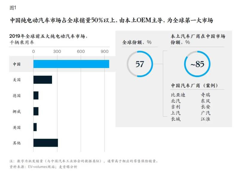 中國汽車市場是全球汽車業(yè)最大的利潤池,貢獻了全球總利潤的1/3(約400億美元)。如今,這個市場正轉(zhuǎn)向電動出行。2014-2019年間,純電動汽車在中國的銷量每年增長80%。2019年中國的純電動汽車銷量超過了90萬輛,全球售出的純電動汽車當(dāng)中,有57%是在中國市場售出的,使中國當(dāng)仁不讓成為全球最大的純電動汽車市場。而從OEM市場份額來看,中國廠商幾乎完全壟斷了這個市場。2019年,國際汽車廠商在純電動汽車市場年銷售量中僅占15%的份額(圖1)。