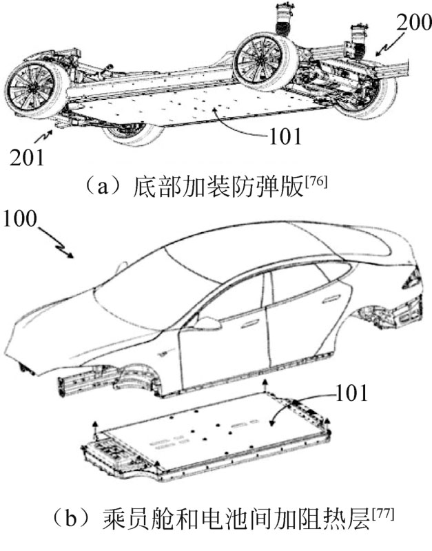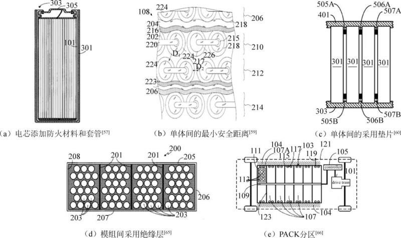 如圖6所示,Tesla通過(guò)在電芯的電極處、外殼上添加防火材料和套管,在單體之間設(shè)計(jì)最小安全距離,采用墊片保持單體在起火后的間距維持不變,使用高效安全閥預(yù)測(cè)單體破裂位置,單體安全閥門打開后即切斷單體與電器的連接等設(shè)計(jì),阻止單體電芯間的熱量擴(kuò)散和發(fā)生熱失控之后引起的鏈?zhǔn)椒磻?yīng)。同時(shí),通過(guò)在電池的電極和電池殼的內(nèi)表面間布置絕熱層,在模組間布置絕緣層,對(duì)PACK分區(qū)進(jìn)行保護(hù)[]的方法,阻隔模組間在發(fā)生熱失控后的熱量傳導(dǎo)和失控?cái)U(kuò)散。這些措施從電芯到模組的層面,層層設(shè)防,以期在內(nèi)部熱失控發(fā)生后最大限度地及時(shí)止損。