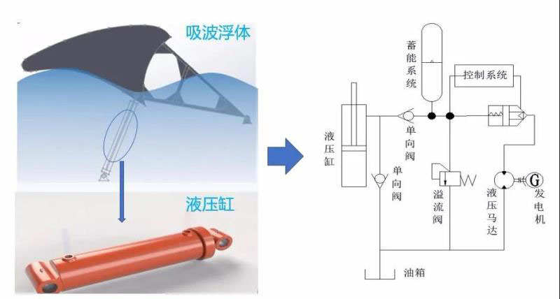 能量轉(zhuǎn)換系統(tǒng)包括二級(jí)能量轉(zhuǎn)換系統(tǒng)和三級(jí)能量轉(zhuǎn)換系統(tǒng)。鷹式波浪能裝置的二級(jí)能量轉(zhuǎn)換系統(tǒng)采用液壓系統(tǒng)(主要由液壓轉(zhuǎn)換系統(tǒng)、蓄能穩(wěn)壓系統(tǒng)、液壓自治控制系統(tǒng)組成),將浮子的往復(fù)機(jī)械能轉(zhuǎn)換為液壓能,再轉(zhuǎn)換為發(fā)電機(jī)的旋轉(zhuǎn)機(jī)械能。三級(jí)能量轉(zhuǎn)換系統(tǒng)(即發(fā)電系統(tǒng))由馬達(dá)、發(fā)電機(jī)、變換電路、負(fù)載組成。液壓轉(zhuǎn)換系統(tǒng)的核心元件通常采用液壓缸,鷹式“舟山號(hào)”波浪能裝置采用雙出桿的液壓缸,安裝在吸波浮體與半潛船體之間。
