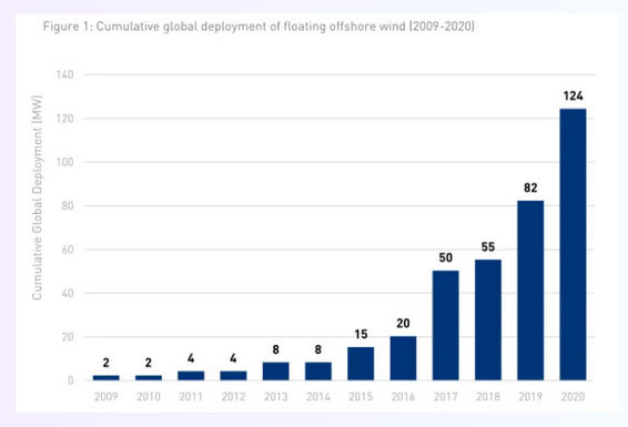 全球海上漂浮式海上風(fēng)電項(xiàng)目累計(jì)裝機(jī)(2009-2020)