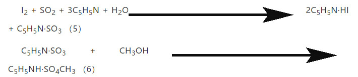 正是因為水分含量比較重要,需要用高靈敏度的卡爾費休方法測試:采用I2、SO2、吡啶、無水CH3OH配制成試劑,與樣品中水反應,計算出樣品中水含量,其測試原理見式(5)和式(6)